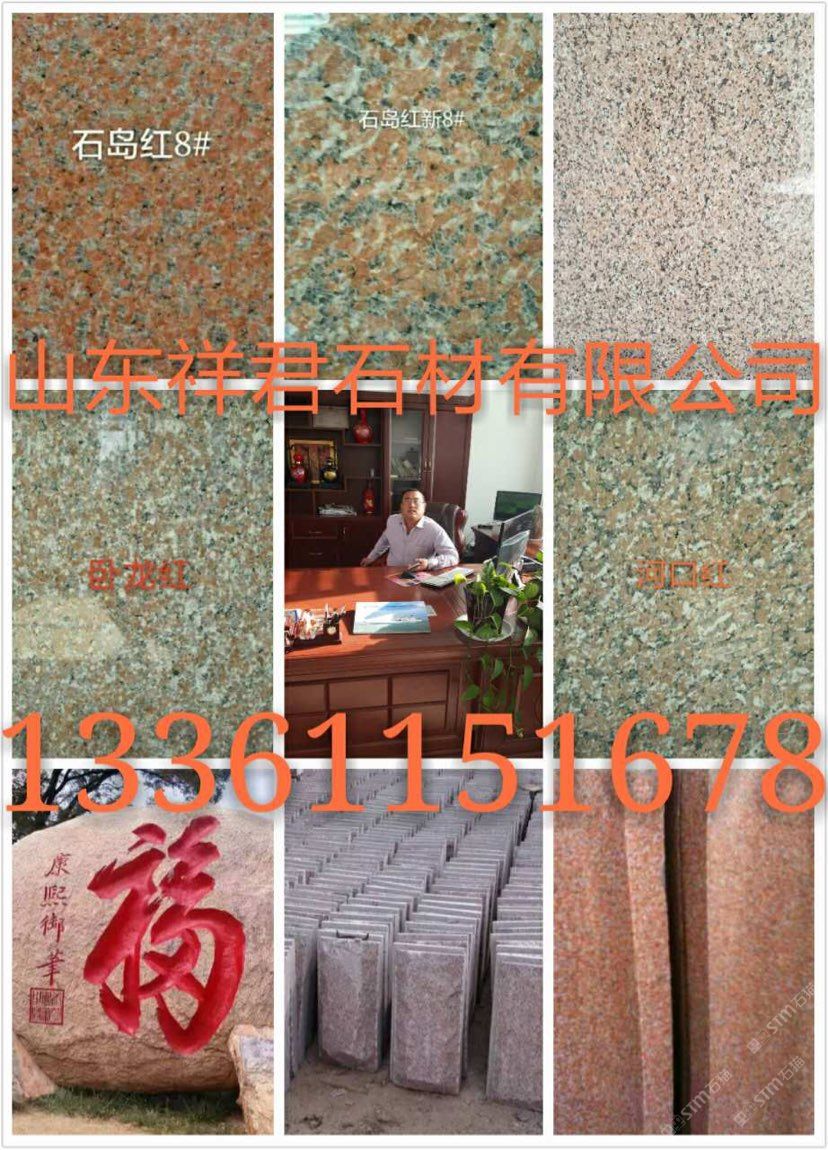 山東榮成市祥君石材有限公司廠價直銷!石島紅!!櫻花紅??!榮成灰!!皇室冰花!!皇室瑪瑙 !! 紫晶鉆!!皇室珍珠!!皇室玫瑰!!皇室啡!!皇室棕鉆!!中磊紅!!龍須紅!!白麻!!黃金麻!!中國棕!!文登灰!等山東石材及異型加工。全自動磨光,大型噴砂機.紅外線切割。