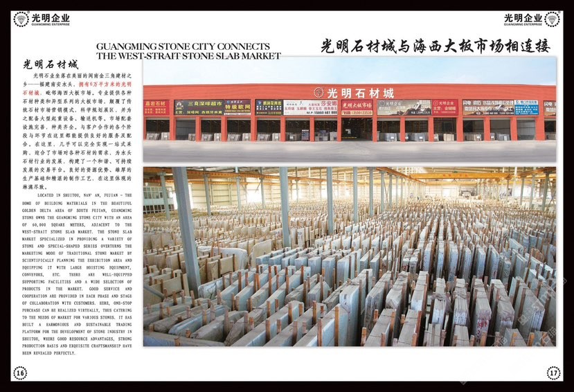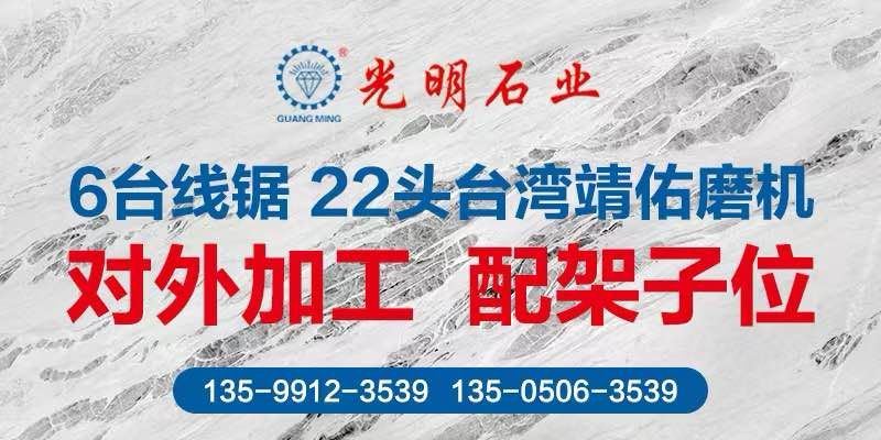 光明石業(yè)創(chuàng)建于1991年,歷經二十多年發(fā)展投資,現(xiàn)已成為集金剛石刀具、礦山開采、多品類石材生產加工、大型工程承接、石材產業(yè)鏈生態(tài)平臺為一體的多元化、跨地域大型石材集團,總注冊資金近2億元,占地幾十萬平方,員工上千人,是中國石材行業(yè)經營規(guī)模、加工水平、綜合實力強的企業(yè)之一。旗下?lián)碛卸嗉易庸?,包括南通新光明石業(yè)發(fā)展有限公司、錦明石業(yè)有限公司、新疆光明礦業(yè)、光明石材城。\\\\\\\\\\\\\\\