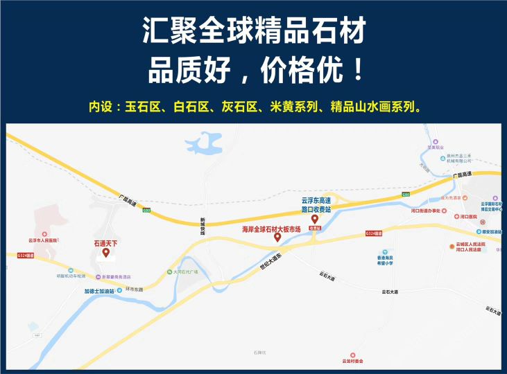 海岸精品石材選材中心屬于海岸石業(yè),中心總面積達(dá)50000平方米,位于連接珠三角和內(nèi)陸地區(qū)、大西南區(qū)域的咽喉樞紐。