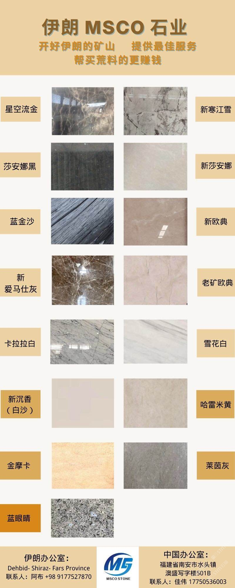 伊朗MSCO公司具備接近15年石材供應(yīng)及礦山經(jīng)營的豐富經(jīng)驗。目前我司在伊朗經(jīng)營兩座自有的大理石礦山,此外多年以來已包過近十座礦山。MSCO公司主營產(chǎn)品種類包括大理石,石灰石,花崗巖。對于伊朗新老礦品種感興趣的企業(yè)老板們,歡迎隨時聯(lián)系咨詢我。
