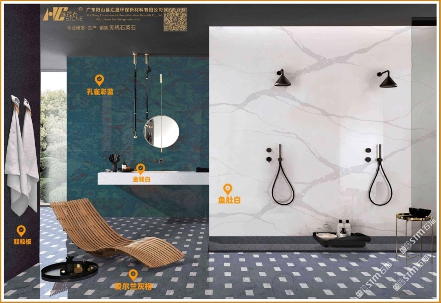 “匯晟石”產(chǎn)品配方和PLC控制自動(dòng)化生產(chǎn)線均為我司自有和自主研制的成熟技術(shù),年產(chǎn)能力為60萬平方米。不含樹脂的無機(jī)石英石裝飾板材是我司專門研發(fā)生產(chǎn)的主打產(chǎn)品。它有別于市面上一般的無機(jī)型人造石、水磨石和樹脂型人造石,區(qū)別在“匯晟石”采用莫氏硬度為7度的石英砂作骨料,配以無機(jī)粘接劑及無機(jī)顏料,以單片壓制技術(shù)制作,通過真空至密高頻震動(dòng)技術(shù)壓制成型,生產(chǎn)過程不添加樹脂粘合劑,為綠色環(huán)保的建材產(chǎn)品。