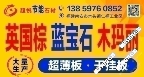 發(fā)布信息: 木瑪麗/藍(lán)寶石/英國棕(超薄板)吳總 13859760852手機(jī)微信同號-福建超悅石材薄板科技有限公司是一家專注于生產(chǎn)、研發(fā)花崗巖超薄板的研發(fā)型企業(yè),秉承“用創(chuàng)新的芯、做超薄的板、走節(jié)能的路”的發(fā)展理念,在多年來堅(jiān)持不懈的努力下,成功地研發(fā)了擁有環(huán)保性能及高新技術(shù)的超薄板,其優(yōu)點(diǎn)可與國際薄板加工技術(shù)媲美。 花崗巖超薄板被廣泛應(yīng)用于復(fù)合板領(lǐng)域,包括保溫材料和鋁蜂窩等,是建筑外墻裝飾材料的。該產(chǎn)品降低了建筑成本、節(jié)約了裝飾 材料,縮短了施工周期,是當(dāng)今社會廣為提倡和國家大力推廣的綠色、環(huán)保、節(jié)能建筑裝飾材料。 公司堅(jiān)持奉行“創(chuàng)新永不止步,品質(zhì)始終如一”的經(jīng)營理念,爭創(chuàng)花崗巖超薄板領(lǐng)導(dǎo)品牌,將花崗巖超薄板做專做精做廣做強(qiáng)。