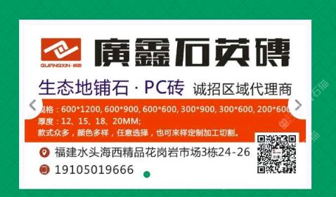 廣鑫石英磚/PC磚 聯(lián)系人:劉    134****2000 查看 手機(jī)號(hào)碼:無 主營范圍: 花崗巖加工、石材外貿(mào)、更多、環(huán)境石材、大理石加工、 企業(yè)地址:福建泉州福建省泉州市南安市水頭鎮(zhèn)海西石材城海五路1-81\\n