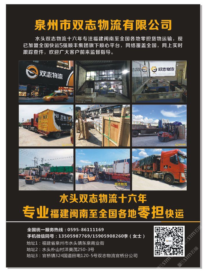 發(fā)布信息: ??【雙志物流】成立于2004年專業(yè)福建閩南至全國石材、瓷磚、巖板、背景墻、機(jī)械設(shè)備等零擔(dān)往返快運(yùn)倉儲(chǔ)配送貨物運(yùn)輸!大泉州地區(qū)同城一日達(dá)物流運(yùn)輸,水頭、官橋、晉江三個(gè)倉儲(chǔ)中心打造大泉州同城智慧物流。歡迎廣大客戶監(jiān)督指導(dǎo)合作共享! 零擔(dān)天天發(fā)車,隨時(shí)可提貨!?????? 歡迎新老朋友來電咨詢 手機(jī)微信同號(hào)? 整車熱線:15905908260 零擔(dān)熱線:18314695339