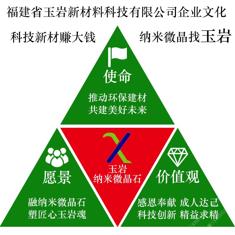 發(fā)布信息: 福建省玉巖新材料科技有限公司 科技新材賺大錢(qián)?納米微晶找“玉巖” 企業(yè)文化: 愿景: 融納米微晶石 塑匠心玉巖魂 使命: 推動(dòng)環(huán)保建材 共建美好未來(lái) 價(jià)值觀: 感恩奉獻(xiàn),成人達(dá)己, 科技創(chuàng)新,精益求精。