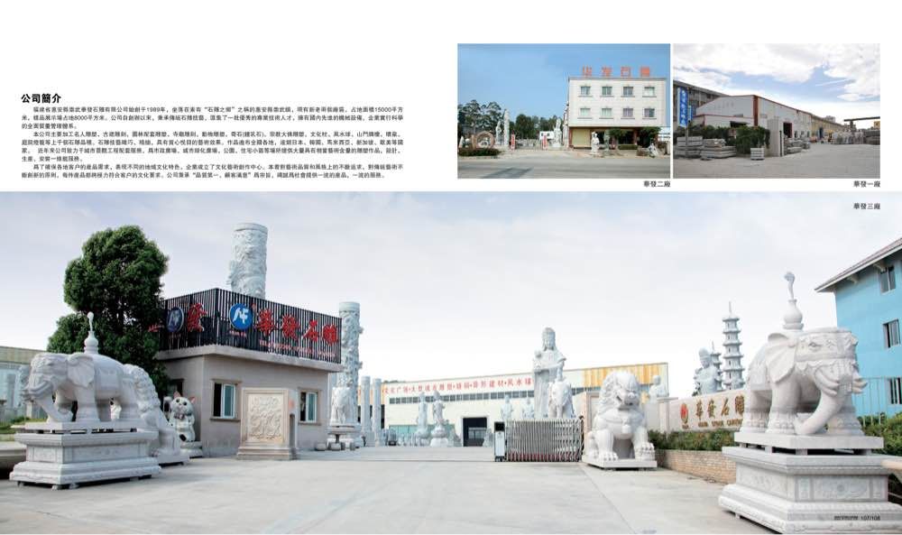惠安縣崇武華發(fā)石雕有限公司 聯(lián)系人:劉喜洋    138****9253 查看 159****3722 查看 主營范圍: 石材雕刻、石材工藝品、花崗巖加工、異型加工、石材工程資質(zhì)企業(yè)、 企業(yè)地址:福建泉州惠安縣S312(惠崇公路)華發(fā)石雕