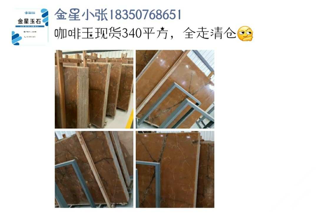 金星石業(yè)有限公司 聯(lián)系人:黃    152****2319 查看 183****8651 查看 主營范圍: 大板批發(fā)、荒料、大理石加工、石材交易市場、玉石加工、 企業(yè)地址:福建泉州南泰石材城H8
