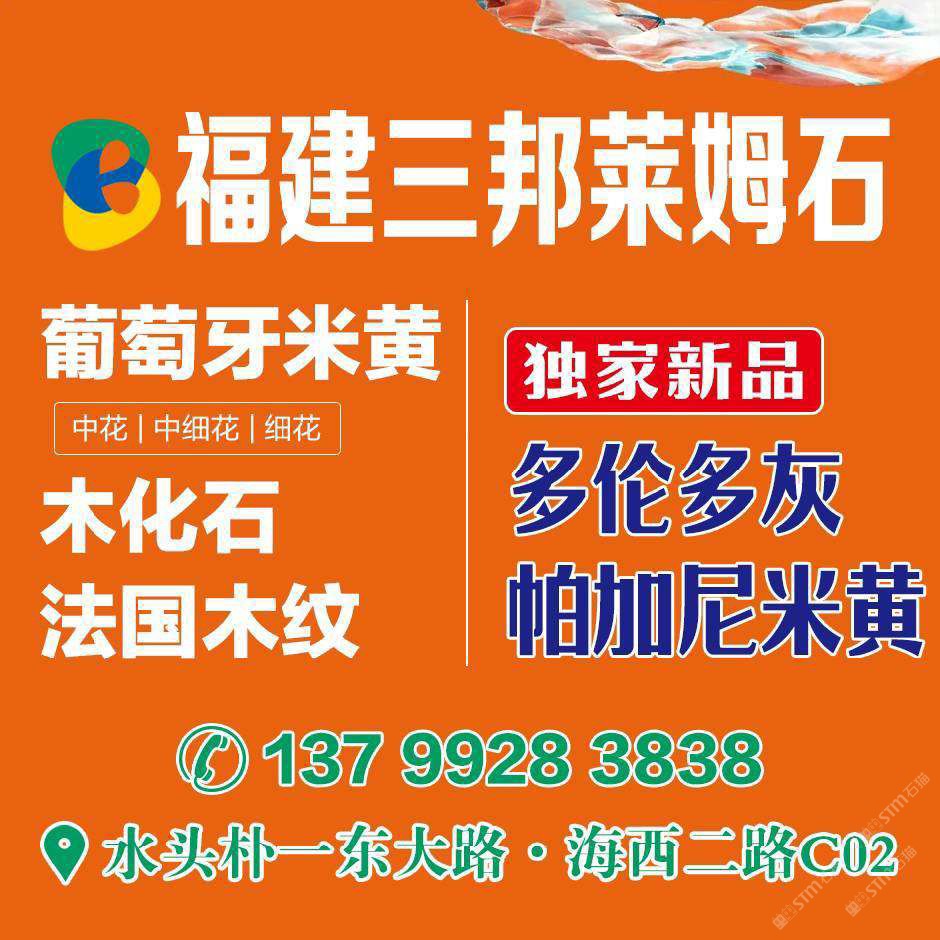 福建三邦石業(yè) 聯(lián)系人:高先生    137****5858 查看 手機(jī)號(hào)碼:無 主營范圍: 大板批發(fā)、異型加工、礦山、石材雕刻、石材工藝品、石材工程資質(zhì)企業(yè)、石材交易市場、水刀拼花、荒料、環(huán)境石材、 企業(yè)地址:福建泉州樸一工業(yè)區(qū)東大路(直走200米)