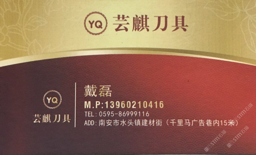 蕓麒刀具 聯(lián)系人:戴磊    139****0416 查看 手機(jī)號(hào)碼:無(wú) 主營(yíng)范圍: 其他、 企業(yè)地址:福建南安水頭鎮(zhèn)建材街千里馬廣告巷內(nèi)