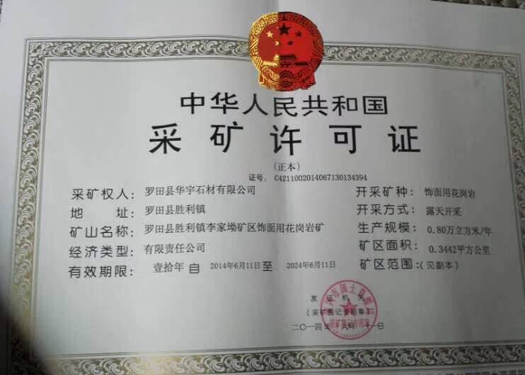 湖北羅田華宇礦業(yè) 聯(lián)系人:王先生    152****6661 查看 152****6661 查看 主營(yíng)范圍: 花崗巖加工、異型加工、荒料、礦山、石材外貿(mào)、 企業(yè)地址:湖北黃岡羅田縣