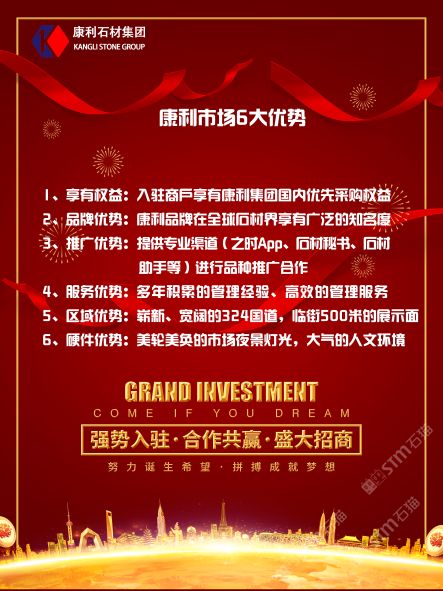 發(fā)布信息: 康利大板市場(chǎng)黃金三期盛大開業(yè),區(qū)域已重新規(guī)劃完成,啟動(dòng)大板市場(chǎng)營(yíng)銷新模式,現(xiàn)規(guī)模龐大,交通便利,性價(jià)比高,市場(chǎng)比往年更加火熱?,F(xiàn)架子位全面對(duì)外招租: 1、架子位租金100元/個(gè)起 2、免費(fèi)提供1間業(yè)務(wù)室 3、免費(fèi)提供石材品種推廣 4、提供激勵(lì)活動(dòng):月出庫(kù)量超出30架部分,免收吊裝費(fèi);月出庫(kù)量超出60架部分,額外獎(jiǎng)勵(lì)5元/架;月出庫(kù)量超出80架部分,額外獎(jiǎng)勵(lì)15元/架 5、市場(chǎng)費(fèi)用收取:裝車費(fèi)30元/架,裝柜費(fèi)50元/架,電費(fèi)1元/度,免水費(fèi)。 詳詢請(qǐng)致電:13859744056(吳先生)或至康利大板市場(chǎng)招商部洽談。