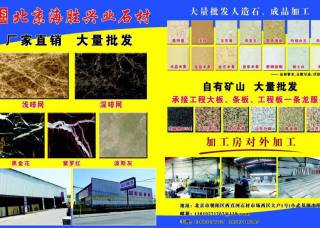 北京海勝興業(yè)石材主營(yíng)產(chǎn)品:山東白麻,山東銹石,山東黃金麻,深啡網(wǎng),淺啡網(wǎng),新紫羅紅,阿富汗黑金花,阿拉善紅,阿拉善黃,芝麻黑654,奧特曼(人造石),淺啡網(wǎng)(人造石),水晶米黃(人造石),金晶米黃(人造石),金花米黃(人造石),珍珠白(人造石),艾美玉(人造石),冰川白玉(人造石),皓月(人造石),金玉滿堂(人造石)企業(yè)地址:北京朝陽(yáng)區(qū)西直河石材市場(chǎng)西區(qū)大戶1號(hào)